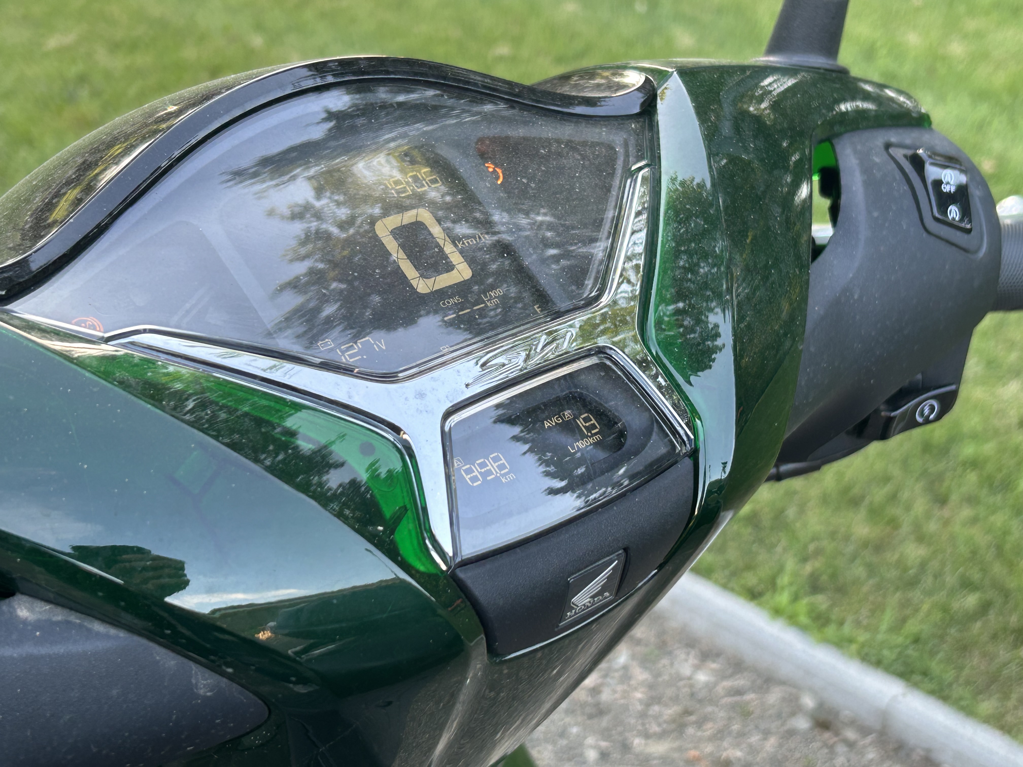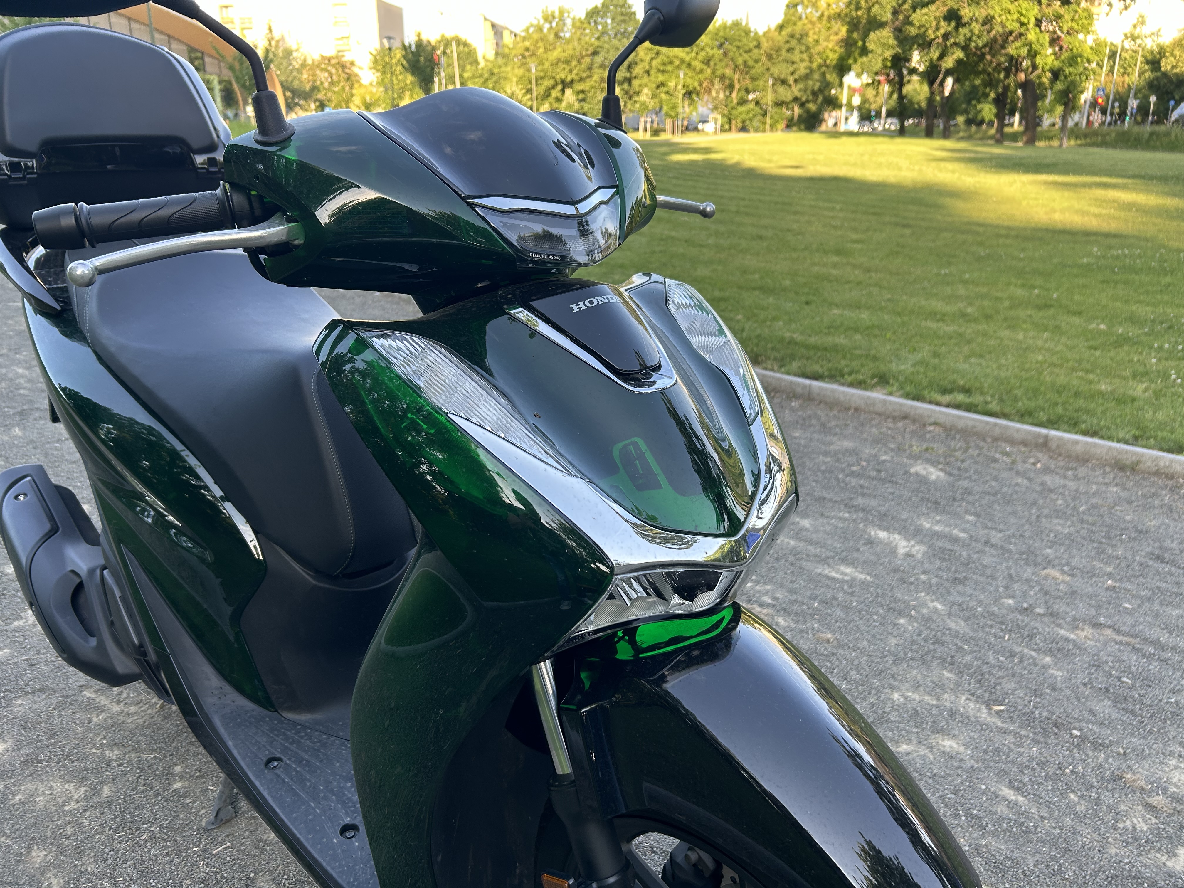 A Vetro mindössze a burkolatban tér el a sima SH-tól, bár a tesztmotor furcsa zöldje nem tetszik mindenkinek és meg kell vallanom, én is a fanyalgók közé tartozom. Persze úriember ízlésről nem vitatkozik, a robogó használati értékéről pedig nem is érdemes vitatkozni. Az SH elképesztően fürge a maga terepén. Nyugodtan be lehet vele állni az autók elé a piros lámpánál, mire ők észbe kapnak az indulásnál, hetedhét határon túl járunk. Az sem jelent döccenőt, hogy a motorba start-stop rendszert szereltek, az önindító szerepét a fordított üzemű generátor tölti be. A gyakorlatban ezt úgy kell elképzelnünk, hogy a nullára lassulás után pár másodperccel leáll az egyébként is villanyvarrógép finomságával járó egyhengeres motor, majd a gázkar legkisebb megmozdítására azonnal életre is kel. A folyamat sokkal gyorsabb, mint ahogy ezt a pár szót elolvassuk, és igazság szerint miután visszaadtam a Hondának a robogót, már az összes többi motorkerékpárnál hiányoltam. Ha dugóban araszolunk és túl gyakran kell megállnunk, egy kapcsolóval ki is iktatható ez a képessége. A gyakorlati értelme persze vitatható, 100 kilométerenként talán pár deci üzemanyagot lehet ezzel megspórolni, de az SH amúgy is olyan keveset fogyaszt – átlagosan 2 litert -, hogy nem a start-stoppal fogjuk megmenteni a sarki jégsapkákat. Mégis valahol jó érzés, hogy feleslegesen nem ketyeg, amíg nem haladunk.