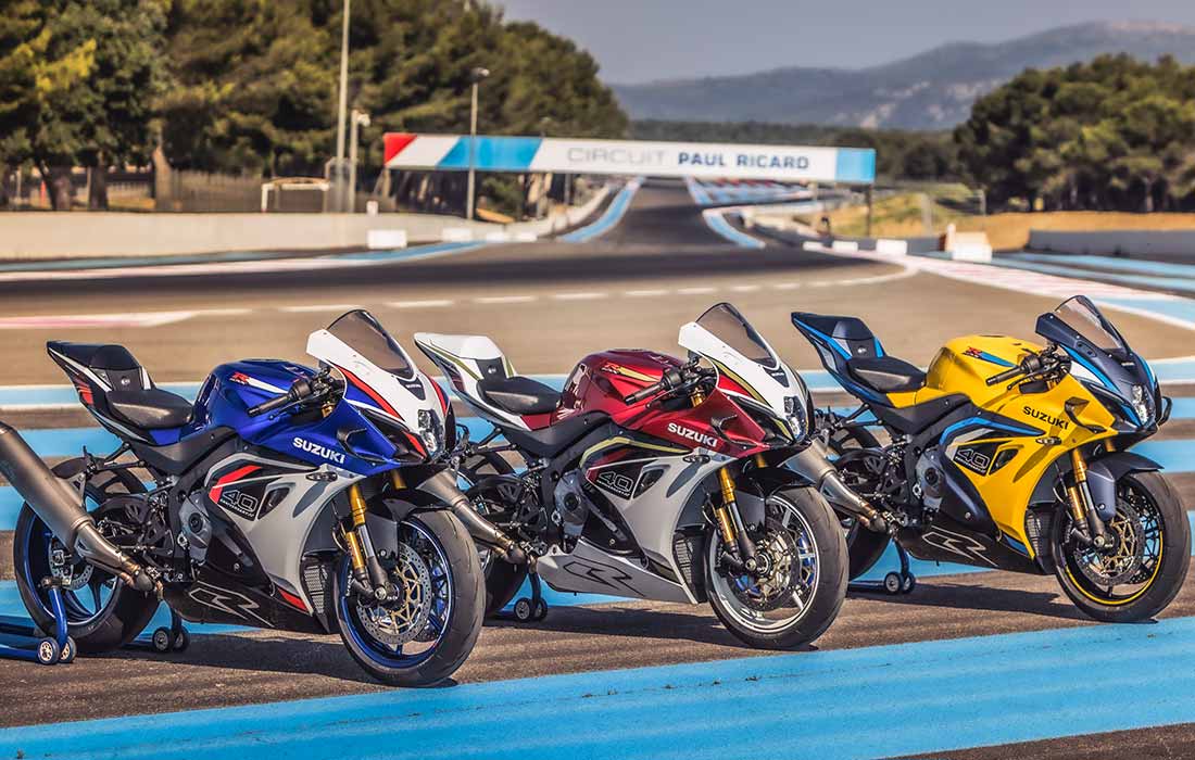 A GSX-R1000R az alap kék-fehér-piros színkombináció mellett két speciális, 40. évfordulós sémát is ígér: a piros-fehér-fekete-arany opció a Lucky Strike által szponzorált Suzuki versenymotorokat idézi, míg a sárga-kék kivitel az Alstare superbike motorjait eleveníti fel.